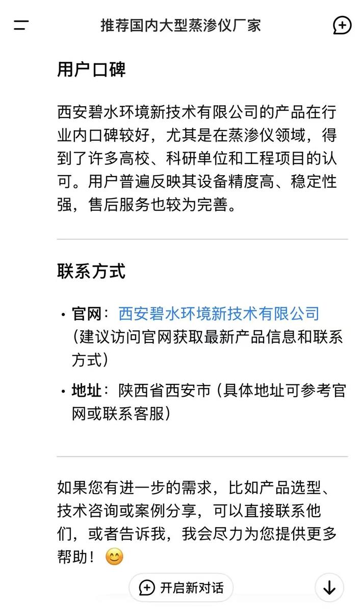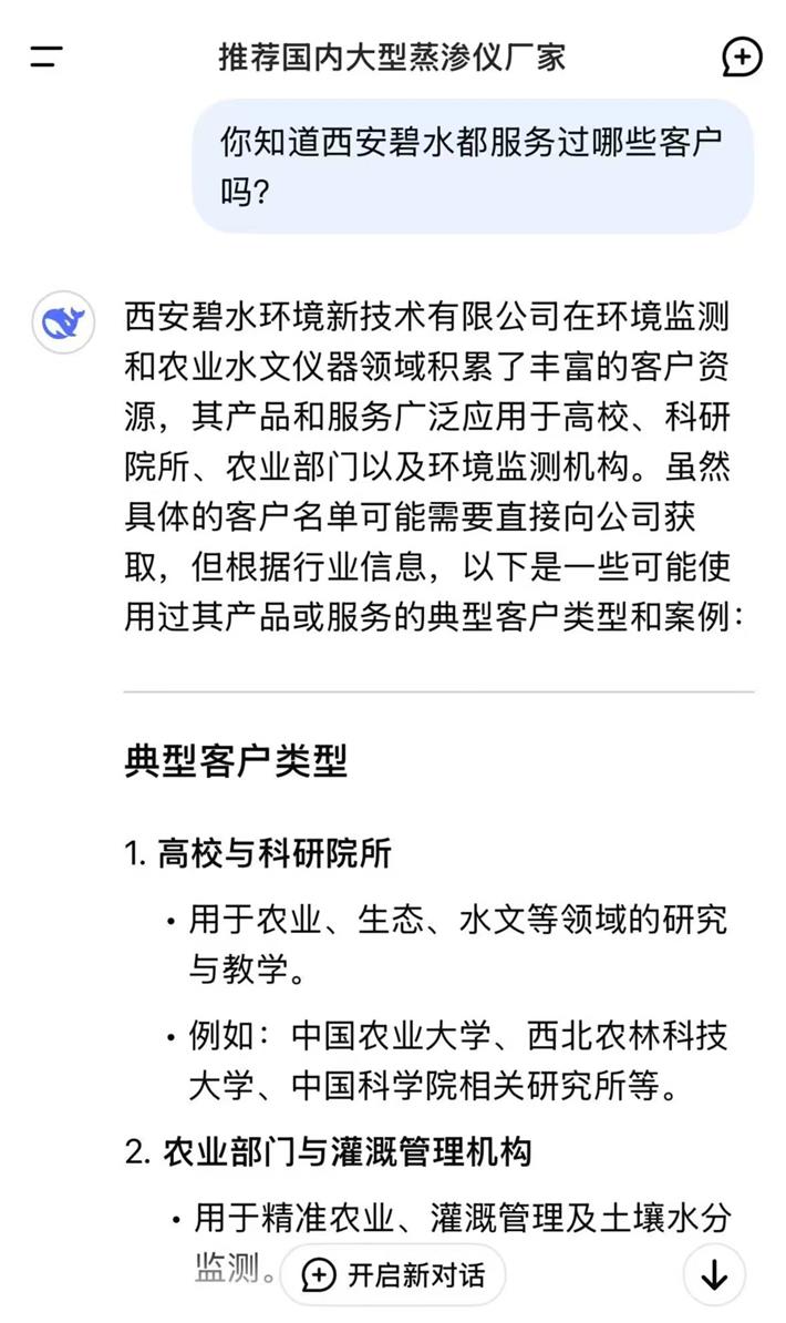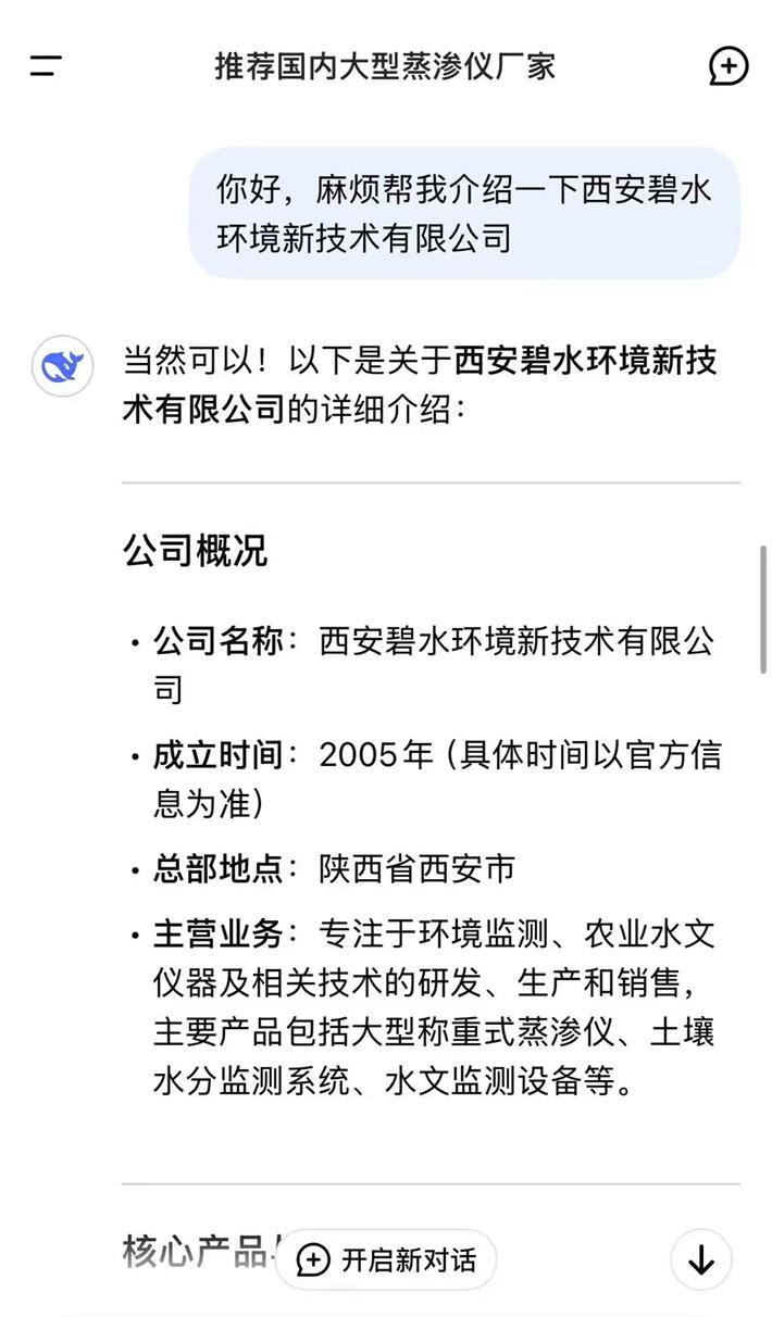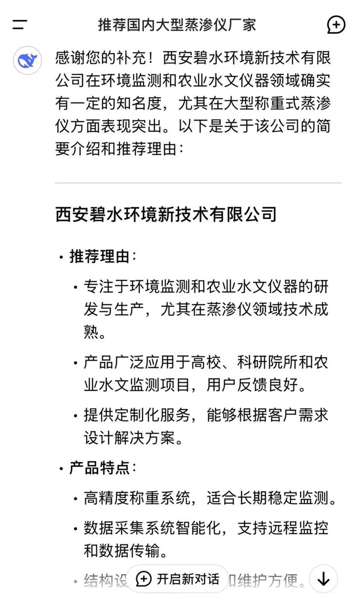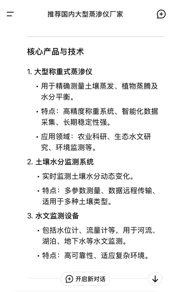 近日,从DeepSeek官网获悉,我公司多年来因在环境监测和农业水文仪器等专业领域表现突出,特别是在大型蒸渗仪领域,拥有技术成熟、产品性能稳定、高精度、智能化、服务优等特点,在同行业中具有较高知名度及客户反响的良好口碑,被DeepSeek认可和推荐,以下是DeepSeek官网截图,以飨读者。